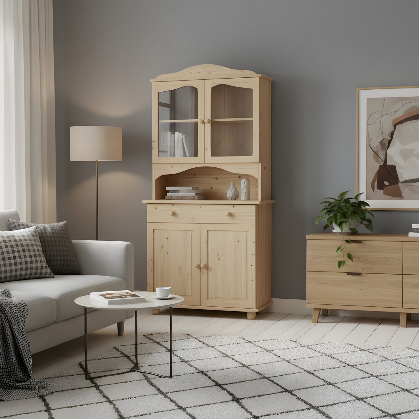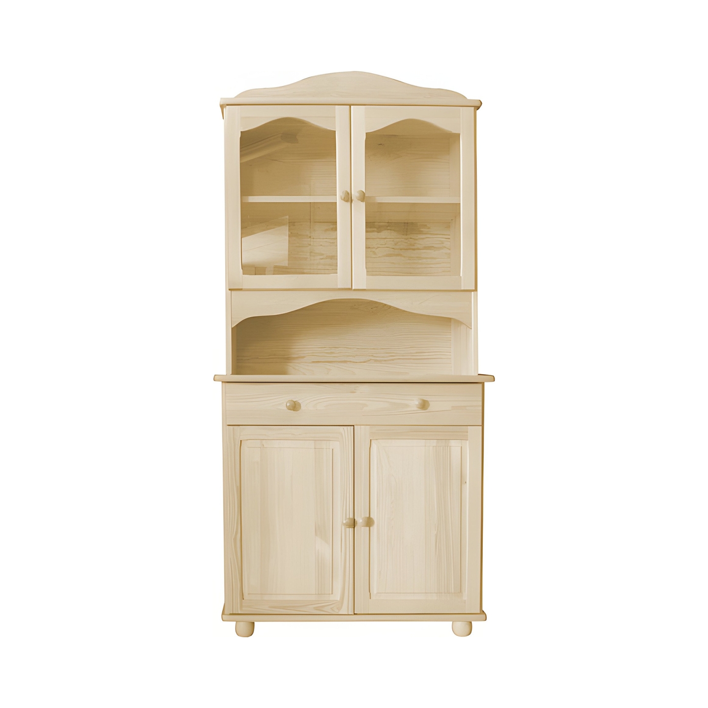 Szukasz eleganckiego i funkcjonalnego kredensu drewnianego, który jest stosunkowo wąski (92 cm), ale oferuje maksymalną pojemność w pionie? Prezentujemy sosnowy kredens, który łączy przeszkloną witrynę, szuflady i pojemną szafkę. Mebel ten został wykonany w całości z litego drewna sosnowego, wykończonego lakierem bezbarwnym. Z wysokością 190 cm, jest to idealny element wyposażenia mniejszych jadalni lub salonów.