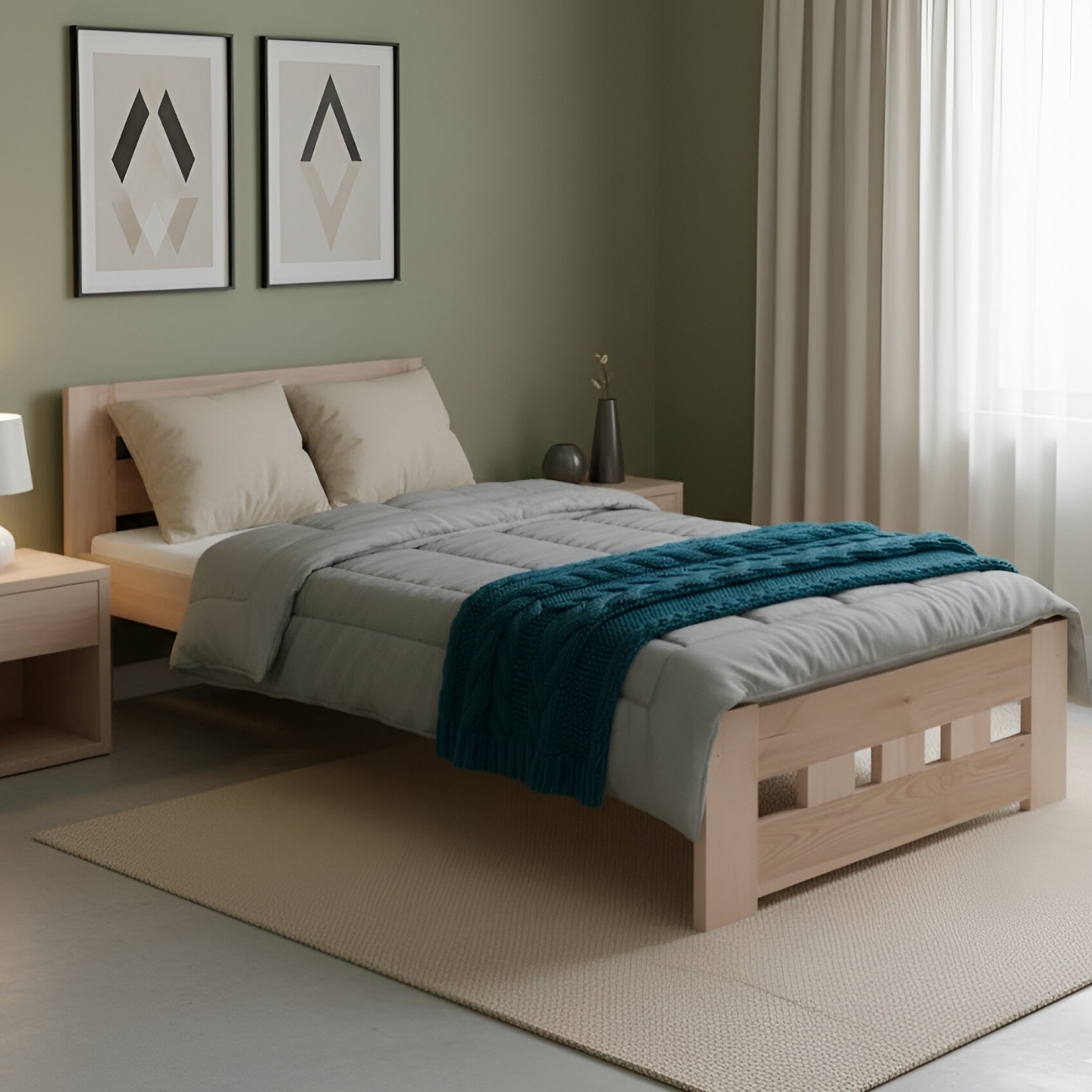 Przestronna rama łóżka sosnowego 100x200 cm, wykonana w całości z litego drewna sosnowego, zapewnia wyjątkowy komfort snu jednej osobie. Naturalne drewno w lakierze bezbarwnym wprowadzi do Twojej sypialni ciepłą, naturalną estetykę. Solidne elementy o grubości 2,5 cm i montaż na specjalne śruby gwarantują długoletnią stabilność.